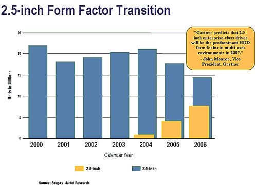 А если так, то почему бы ни предложить пользователю жесткий диск той же емкости, но меньшего размера? Тем более что уменьшение размера позволяет сделать диск более быстрым и менее энергоемким. Действительно, уменьшение размера пластин позволяет уменьшить энергопотребление мотора шпинделя и, соответственно, тепловыделение. Коромысло, на котором крепятся головки, становится короче, следовательно, можно повысить скорость его перемещения. Да и расстояние, на которое нужно перемещать головки, тоже уменьшается. В результате уменьшается время поиска, что приводит к росту производительности диска. А если учесть обещанную в ближайшем будущем поддержку Serial Attached SCSI, модель получается весьма интересной. Смотрите сами