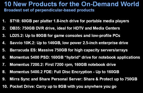 Изучая список новинок, обратите внимание, что новые продукты распределены по всем сегментам рынка — помимо всего прочего, покупатель (ОЕМ и пр.) может удовлетворить практически все свои запросы, работая только с Seagate. Заметим, что во всех своих новых продуктах Seagate использует технологию перпендикулярной записи, которая позволяет повысить плотность записи и уменьшить механическую активность диска.