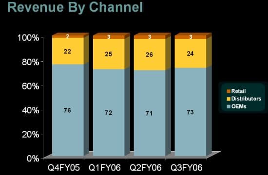 Как видно, львиная доля продукции Seagate поставляется OEM-партнерам, более-менее стабильно четверть продукции уходит дистрибьюторам, а на ретейл-продажи приходится мизерная часть. Как раз здесь компании может помочь приобретение Maxtor, которая традиционно имела очень сильные позиции именно на розничном рынке, особенно в Америке.