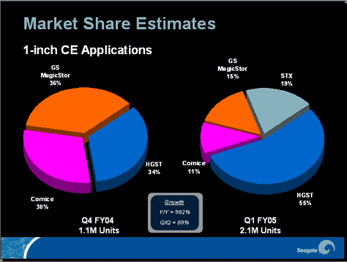 Первыми среди новинок были представлены однодюймовые дисковые накопители Seagate серии ST1 емкостью 2,5 ГБ и 5 ГБ для карманных устройств. Винчестеры серии ST1 совместимы со всеми существующими стандартами портативных устройств, использующих дисковые накопители. Специальная новая технология обеспечивает более качественную работу диска при тряске и вибрациях во время ходьбы.