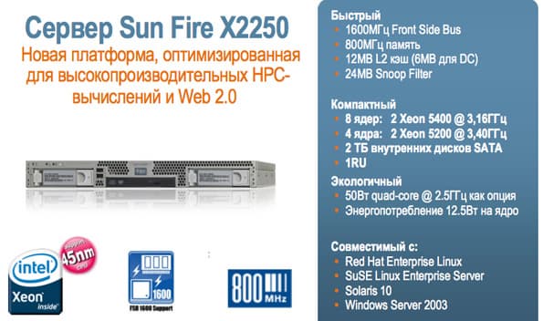 На платформе Intel выпущен сервер X2250 для приложений Web 2.0 и высокопроизводительных HPC-вычислений. Он сочетает в себе шину с частотой 1600 МГц, процессоры с частотой 2,5 ГГц и сниженным энергопотреблением, память с частотой 800 МГц, а также поддержку операционных систем Runs Linux, Solaris, Windows.
