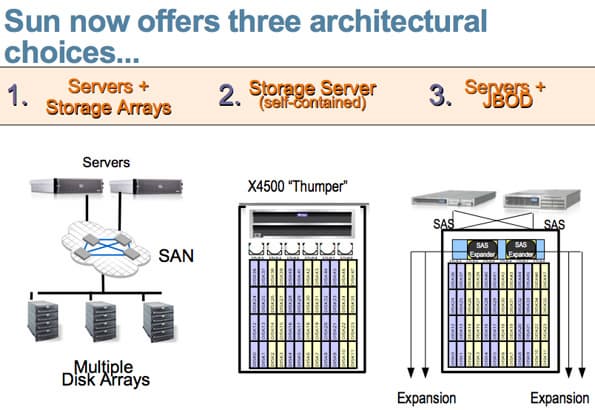 В настоящее время Sun предлагает на выбор три архитектуры построения хранилища данных: сервер и набор контейнеров, серверы-хранилища и серверы с дисковыми массивами (JBOD).