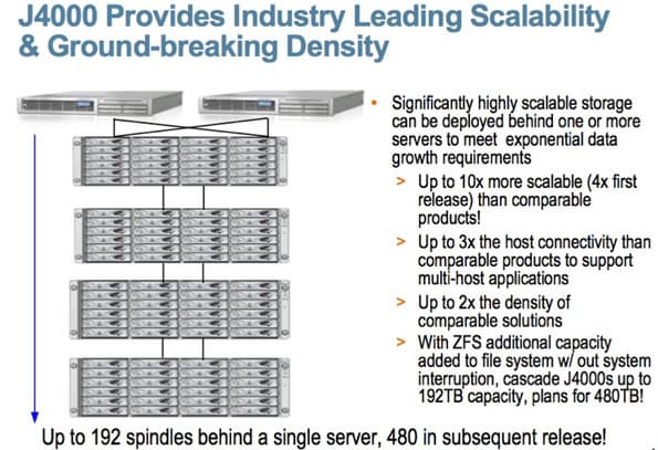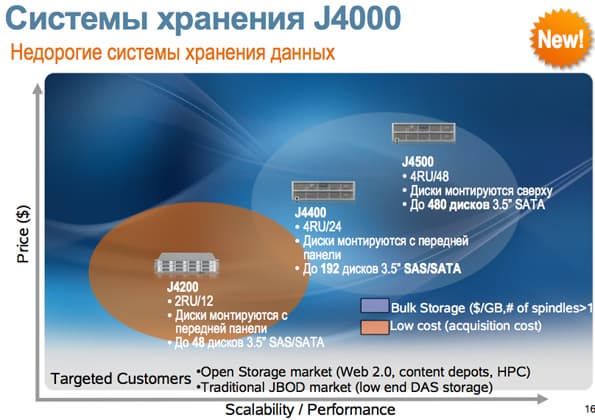 Новая линейка высокопроизводительных дисковых массивов Sun Storage J4000 — это хранилища данных, созданные для того, чтобы удовлетворить потребность заказчиков в хранении постоянно увеличивающихся объемов данных. Модули могут быть подсоединены к одному или нескольким серверам. Хранилища данных легко масштабируются: уже сейчас доступны решения вместимостью 480 ТБ систем.