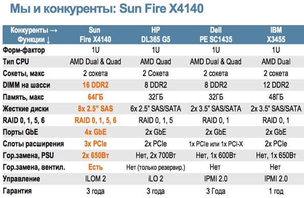 - Sun Fire X4140 занимает одну монтажную единицу, использует двух- и четырехъядерные процессоры AMD, максимальный объем памяти 64 ГБ, до 16 модулей DDR2 на шасси. Поддерживается до восьми жестких дисков формата 2,5″ с интерфейсом SAS, с возможностью организации RAID 0, 1, 5, 6. Имеет четыре порта Gb Ethernet, три слота расширения PCIe. Сервер имеет два блока питания мощностью 650 Вт с возможностью горячей замены, также возможна горячая замена вентиляторов системы;