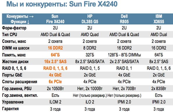 - Sun Fire X4240 занимает две монтажные единицы, использует двух- и четырехъядерные процессоры AMD, максимальный объем памяти 64 ГБ, до 16 модулей DDR2 на шасси. Поддерживается до 16 жестких дисков формата 2,5″ с интерфейсом SAS, с возможностью организации RAID 0, 1, 5, 6. Имеет четыре порта Gb Ethernet, шесть слотов расширения PCIe. Сервер имеет два блока питания мощностью 1050 Вт с возможностью горячей замены, также возможна горячая замена вентиляторов системы.