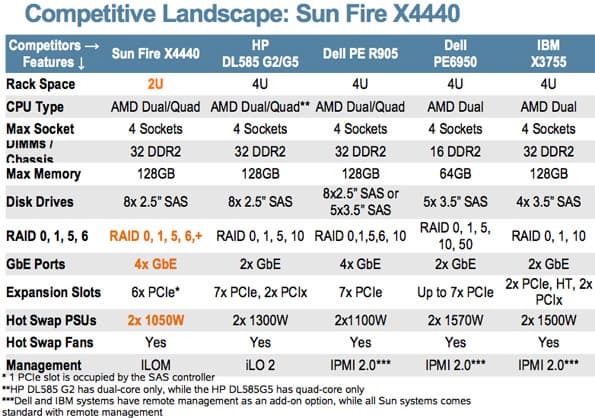 - Sun Fire X4440 занимает две монтажные единицы, использует двух- и четырехъядерные процессоры AMD, максимальный объем памяти 128 ГБ, до 32 модулей DDR2 на шасси. Поддерживается до восьми жестких дисков формата 2,5″ с интерфейсом SAS, с возможностью организации RAID 0, 1, 5, 6, +. Имеет четыре порта Gb Ethernet, три слота расширения PCIe (один из них занят контроллером SAS). Сервер имеет два блока питания мощностью 1050 Вт с возможностью горячей замены, также возможна горячая замена вентиляторов системы.