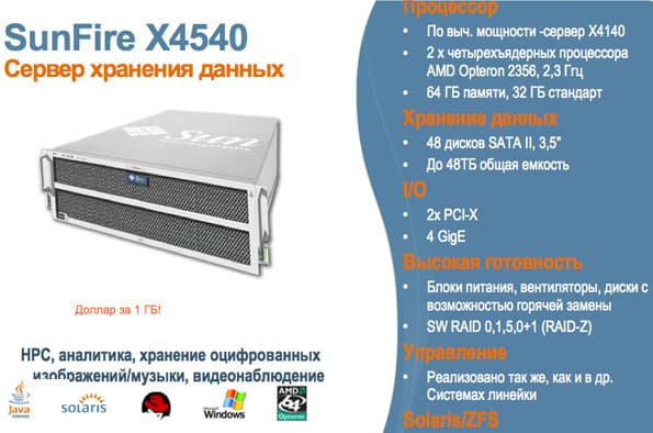 Появился также и новый сервер хранения данных X4540, предназначенный для аналитики, хранения оцифрованных изображений, музыки и видеонаблюдения. По вычислительной мощности это решение соответствует серверу X4140. Сервер оснащается двумя четырехъядерными процессорами AMD Opteron 2356 с тактовой частотой 2,3 ГГц, до 64 ГБ оперативной памяти. Хранение данных обеспечивается 48 жесткими дисками (до 48 ТБ общий объем памяти). Поддерживается RAID 0, 1, 5, 6, 0+1 (RAID-Z).