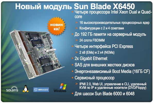 Новинки в линейке Blade-серверов представлены решением Sun Blade X6450. Модуль содержит четыре процессора Intel Xeon Dual и Quad-Core, до 192 ГБ памяти, четыре интерфейса PCI Express, два порта Gb Ethernet, интерфейс SAS для подключения внешних дисков.