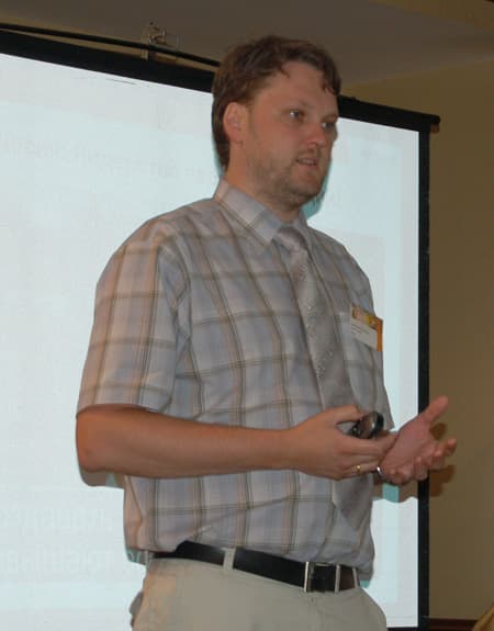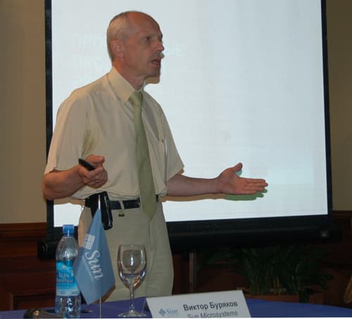 О новинках и главной концепции ПО, разрабатываемого в компании Sun Microsystems, рассказал Виктор Буряков, руководитель отдела программных продуктов, однако стоить упомянуть, что каждый из предшествующих докладчиков также затронул в своей презентации тему основных преимуществ программных решений Sun.