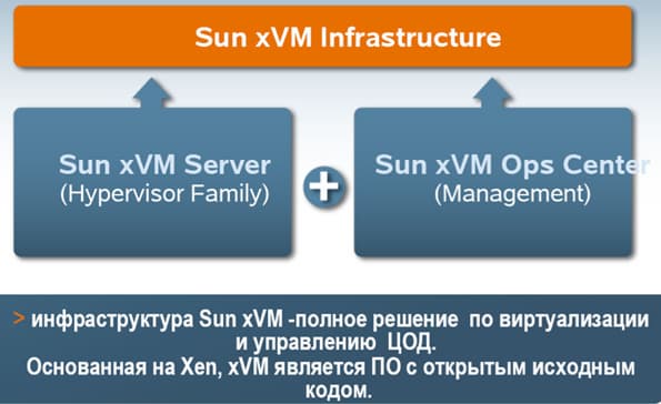 - xVM — это универсальное ПО с открытым кодом для задач виртуализации систем (от терминала до ЦОД). Оно включает модули разработки и управления готовым решением.