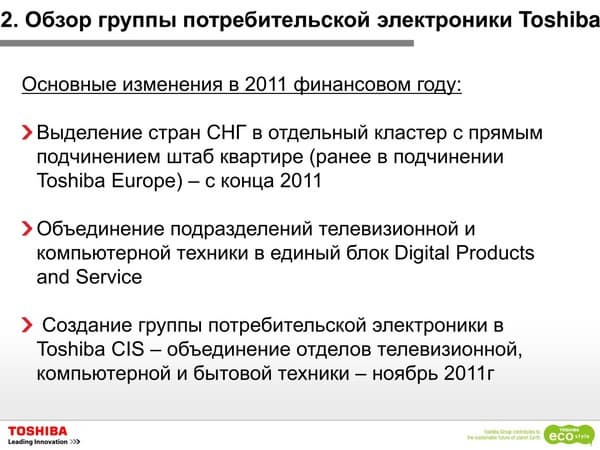 11 апреля компания Toshiba провела важную пресс-конференцию. На ней не просто были объявлены новые продукты и планы развития: компания завершила реструктуризацию, которая длилась всю вторую половину 2011 года, и представила ее результаты. На презентации был сделан целый ряд важных заявлений, касающихся будущего компании Toshiba.