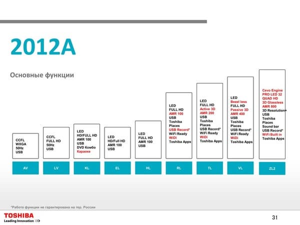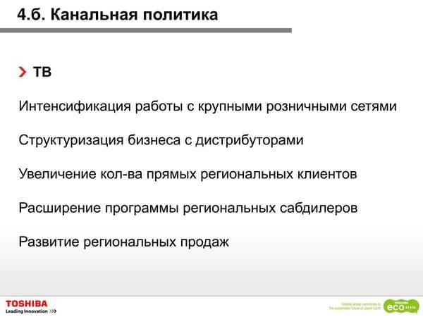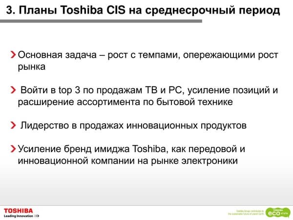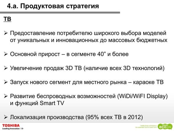 В сегменте телевизоров Toshiba предполагает развивать партнерство с торговыми сетями и делать ставку на регионы, где конкуренция не так сильна, как в Москве и крупных городах.