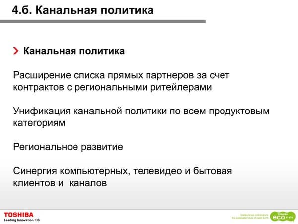 Отдельно следует отметить, что сейчас компания пересматривает свою рекламную и маркетинговую политику. Компания хочет не просто поднять интенсивность, но и постоянно контролировать эффективность маркетинговой деятельности, в случае необходимости оперативно внося коррективы. Одним из направлений должно стать восстановление позиций бренда Toshiba в целом на российском рынке. Планируется, что это имя будет ассоциироваться с инновационностью и надежностью. Максимальная интенсивность рекламных программ придется на 3-й и 4-й кварталы.