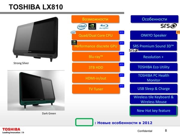 Подчеркну, зеленой рамкой обведены новшества 2012 года для этой линейки. Наиболее интересными особенностями я бы назвал отличную акустику, возможность установки монитора с трехмерной картинкой, не требующего очков. Впрочем, и остальные характеристики очень неплохие.