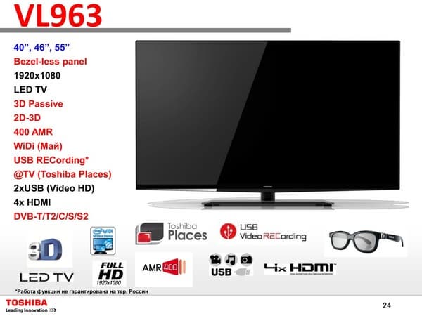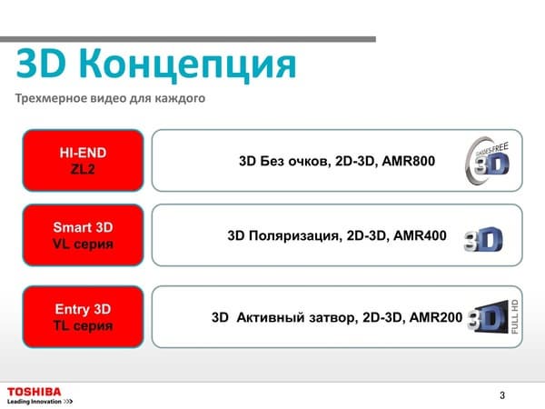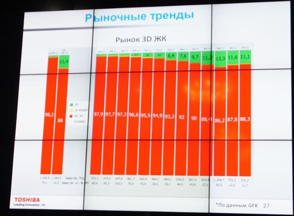 На рынке существуют очень разные технологии, и Toshiba имеет модели на любой вкус. Причем сейчас уже создана технология создания трехмерного телевидения без очков, которая позволяет подстраиваться под нескольких пользователей.