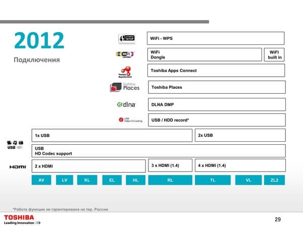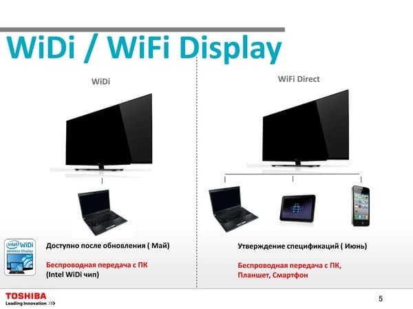 На данный момент это Intel WiDi, но в ближайшем будущем Toshiba планирует перейти на более универсальную технологию WiFi Direct, которая позволит работать с любыми устройствами, в т. ч. и мобильными.