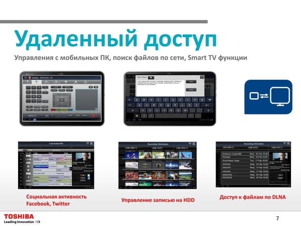 Наконец, Toshiba предлагает технологии дистанционного управления телевизорами с технологией Smart TV через любые типы мобильных устройств.