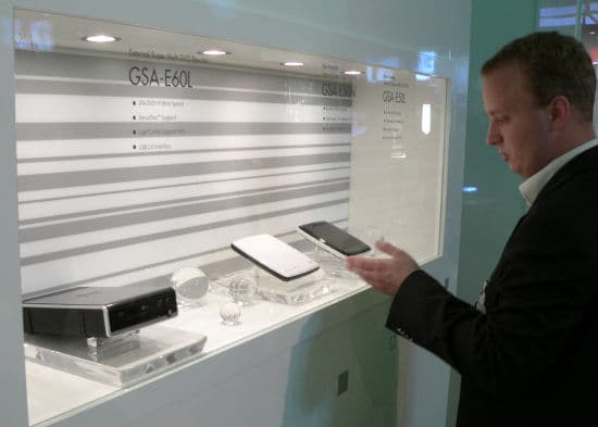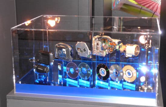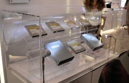 Наконец, треть стенда была отдана отделу HD-DVD. Здесь можно было увидеть и базу привода, и образцы носителей, и новые модели плееров, и даже образцы ноутбуков от разных производителей, в которых используются оптические приводы HD-DVD.