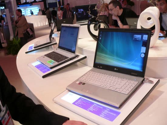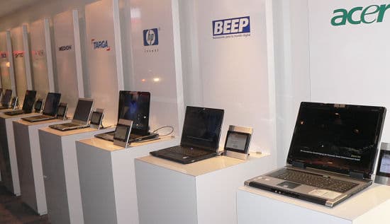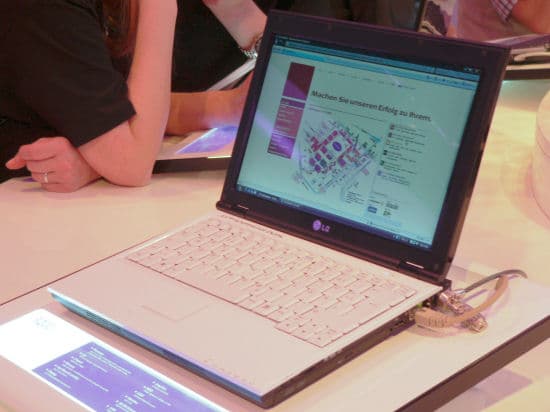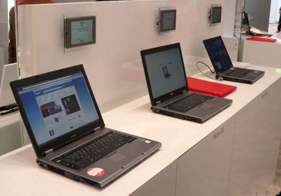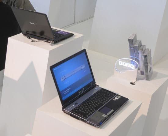 В середине выставки нам попался любопытный стенд компании Benq, он функционировал как интернет-кафе, на стоящих там ноутбуках можно было спокойно выйти в Интернет. Как раз недавно мы тестировали ноутбук R55, дизайн которого оставил плохое впечатление — ноутбук выглядел дешево. Это впечатление подтвердилось и тут, однако другие ноутбуки BenQ произвели чрезвычайно приятное впечатление, особенно нам понравилась 73-я серия.