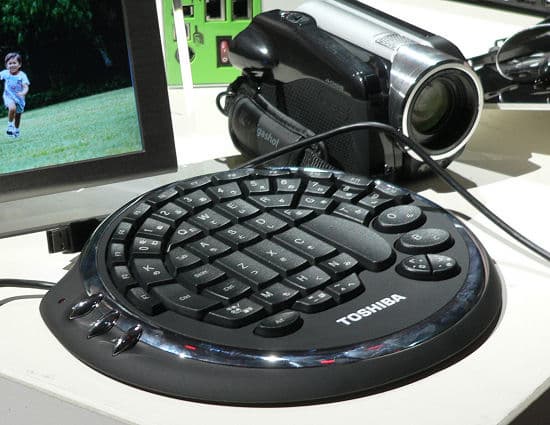 Во-вторых, в конце презентации на столе появилась еще один интересный предмет — так сказать, специальная клавиатура для геймера. В играх одна рука всегда лежит на мышке, а под второй очень хочется иметь много удобно расположенных клавиш для разных игровых функций, тут как раз и пригодится эта штука от Toshiba: она дублирует все клавиши с клавиатуры, которые расположены там, где обычно находится вторая рука геймера, рассчитана именно на игровое применение, а не печать. Устройство должно быть интересным, вопрос — сколько оно будет стоить. Кстати, у нас в новостях проходила информация по аналогичным устройствам на российском рынке.