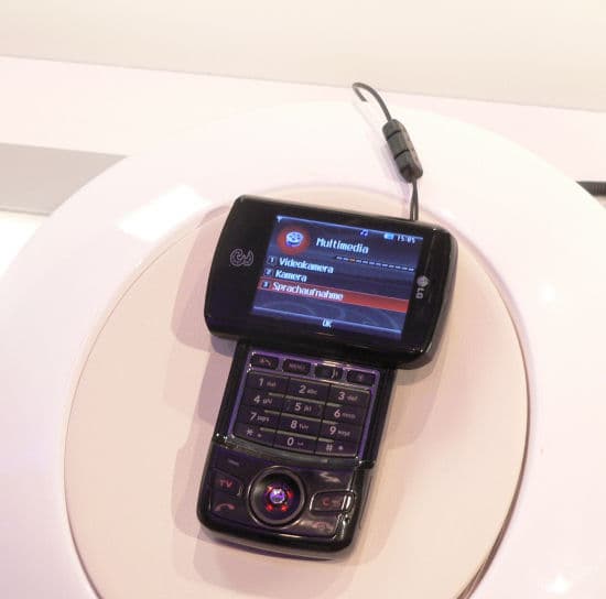 Значительная часть стенда посвящена моделям сотовых телефонов, в том числе, компания представила много моделей для сетей 3G, это одна из них. Экран тут крутится вокруг своей оси (мы сразу открыть его не смогли). Кстати, на паре телефонов показывали телепередачи, наглядно демонстрируя преимущества стандарта.