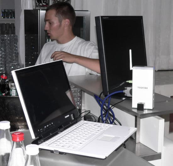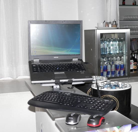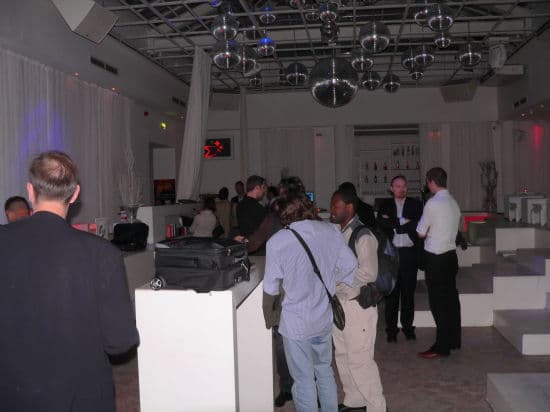 В первый день компания Toshiba проводила презентацию новой широкой линейки аксессуаров для ноутбуков. Мероприятие было организовано в стильном берлинском баре White bar — большое помещение без стульев, с сиденьями в виде «ступенек», как в древнем театре. К сожалению, в помещении царил полумрак, что не лучшим образом сказалось на качестве фотографий.