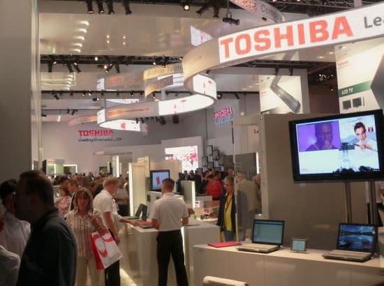Наконец, громадный стенд Toshiba. Компания очень серьезно подошла к выставке. Представлены практически все новинки и перспективные образцы, имеющиеся у компании, стенд оформлен грамотно и со вкусом. Кстати, стенд Toshiba был ярким, благодаря чему удалось рассмотреть все новинки под интенсивным светом.