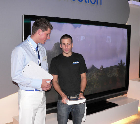 Порадовала огромная плазменная панель. К сожалению, сфотографировать ее нормально не удалось: народ ломится прямо перед рядом мониторов, поймать момент, когда там никого нет, нереально (а учитывая проблемы из-за слишком длинных выдержек на некоторых кадрах, — и невозможно). Кстати, это общая проблема: из-за вездесущих близоруких посетителей, которые бродят по стендам, испорченными оказалось более половины всех кадров.