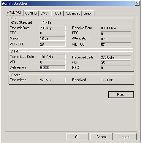 Сразу же отображается статистика подключения (скорости, модуляция, количество переданных/принятых ячеек и пакетов).