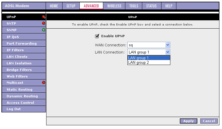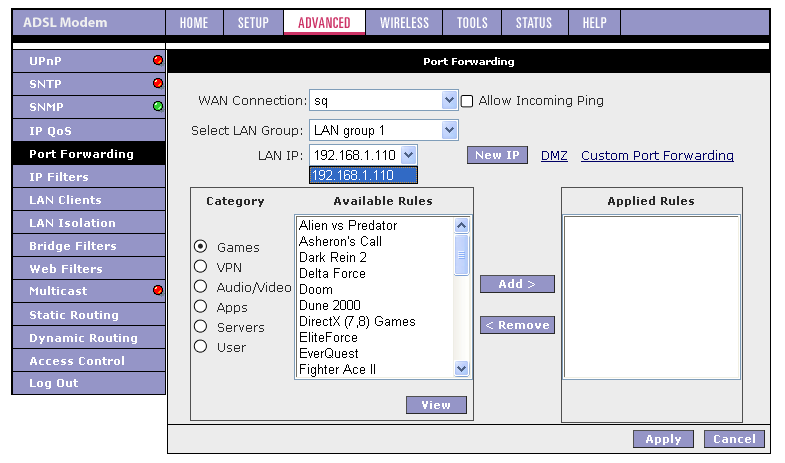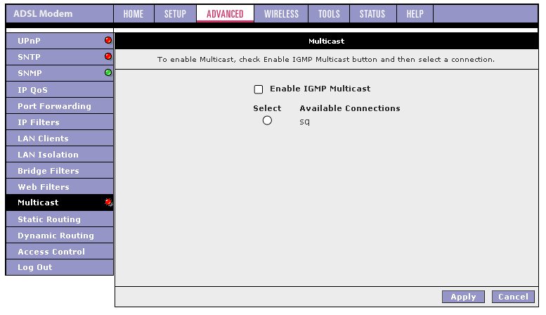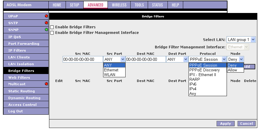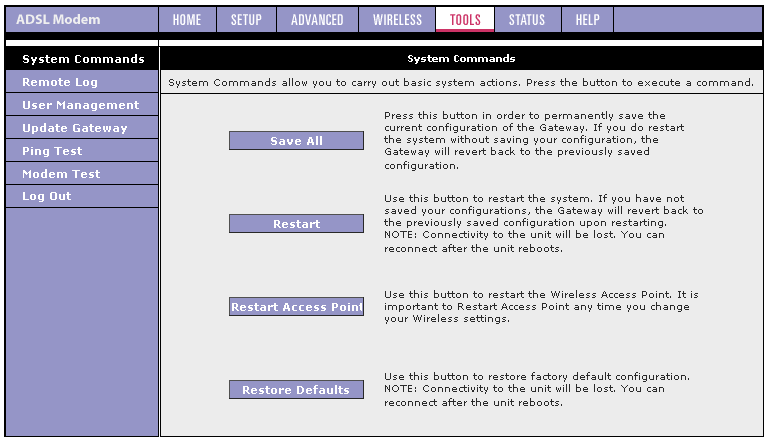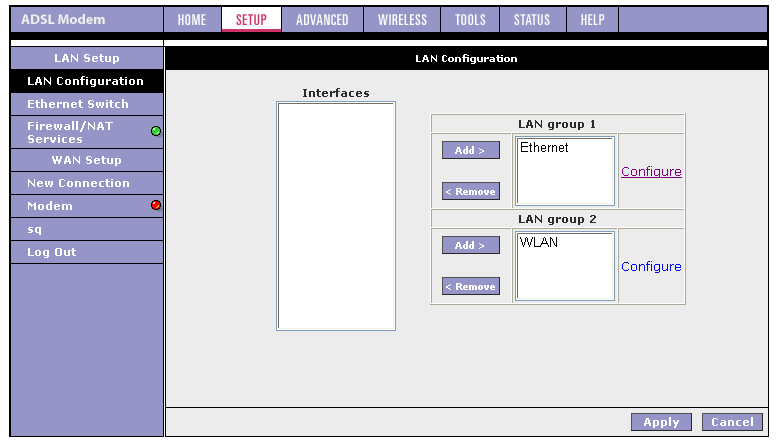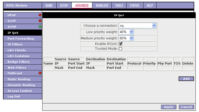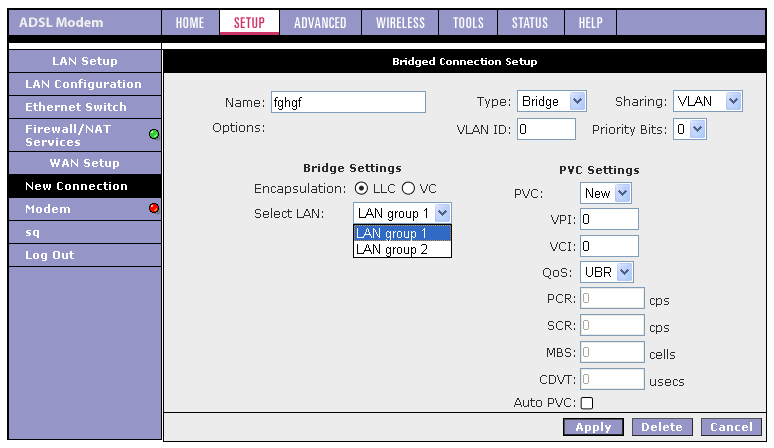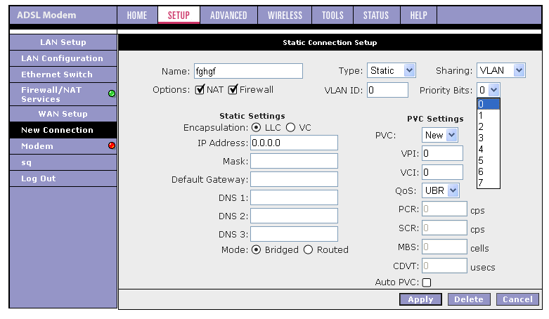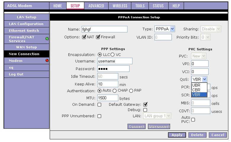 Хочу также отметить, что если появится необходимость в изменении параметров ADSL-соединения, то придется удалить существующее соединение и заново его создать с новыми параметрами. Это вызывает некоторые неудобства (например, если я хочу изменить VPI и VCI соединения, то мне придется заново создать соединения и выставить вручную все остальные параметры).
