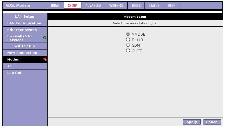 | WAN | тип | ADSL (ITU Annex A) | ||