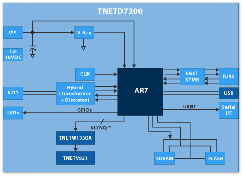 Устройство выполнено на базе процессора Texas Instruments TNETD7200 (32-битный RISC процессор для использования в ADSL-устройствах)