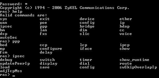 Обычно в устройствах ZyXEL консольный интерфейс выполнен в виде экранного меню, а система команд реализована как дополнительная возможность. Здесь мы видим просто систему команд операционной системы ZyXEL ZyNOS 3.4. Интерфейс команд данной операционной системы подробно рассматривать не будем.