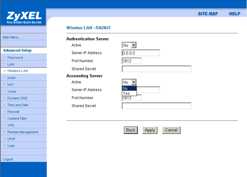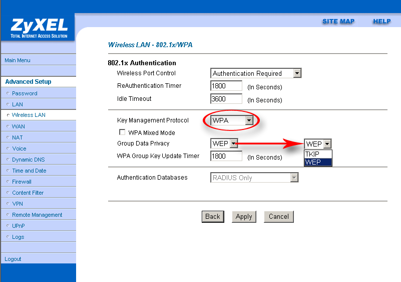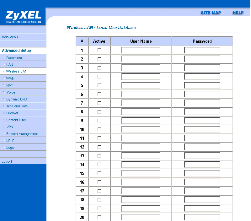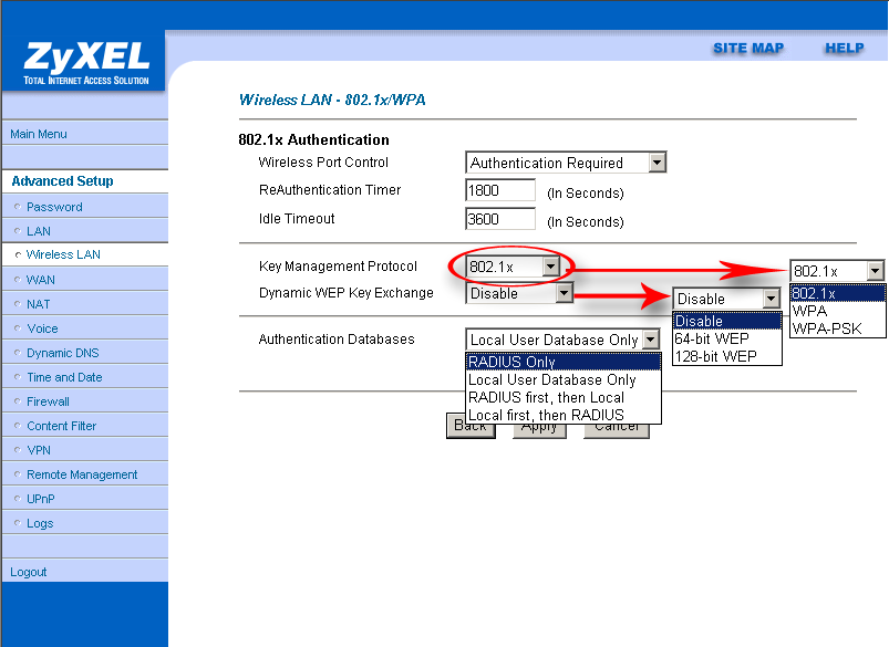 Настройки роутера не позволяют подробно задать параметры беспроводной связи, нет даже возможности выбора режима (b/g). Зато обширно представлены расширенные настройки безопасности беспроводной связи. Есть возможность использования Radius-сервера для аутентификации или же создания локальной базы пользователей (до 32 записей) с возможностью задания логина/пароля для каждого. При этом может одновременно использоваться локальная база пользователей и Radius-сервер
