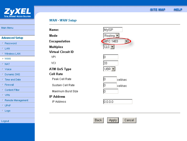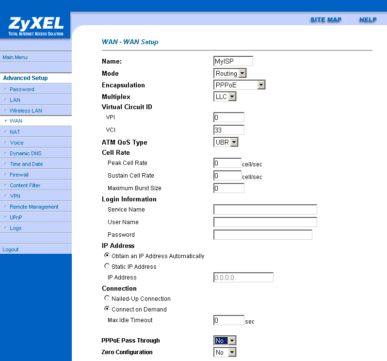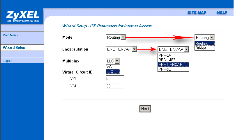 В пунктах VPI и VCI указываются идентификатор виртуального пути, и идентификатор виртуального канала соответственно — эта информация предоставляется провайдером (стандартные настройки соединения через ATM).
