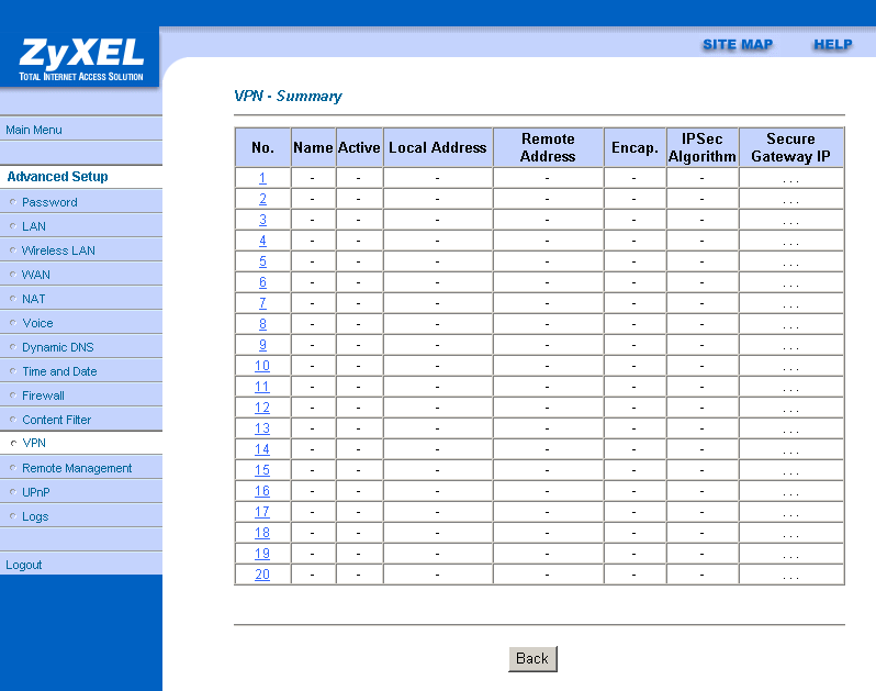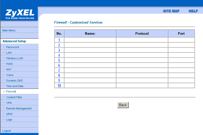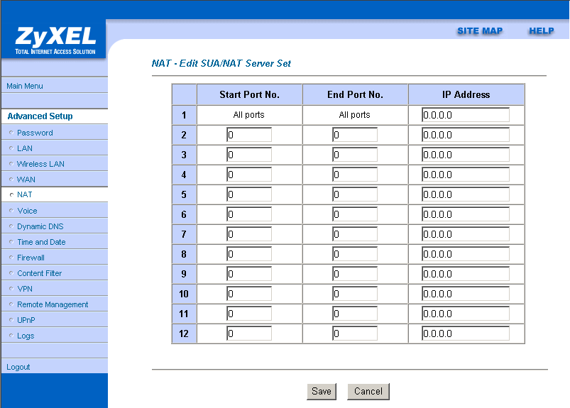 Настройки SUA Only NAT разрешают задать до 11 виртуальных серверов.