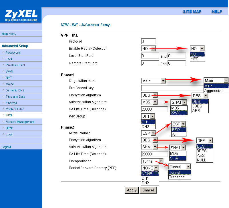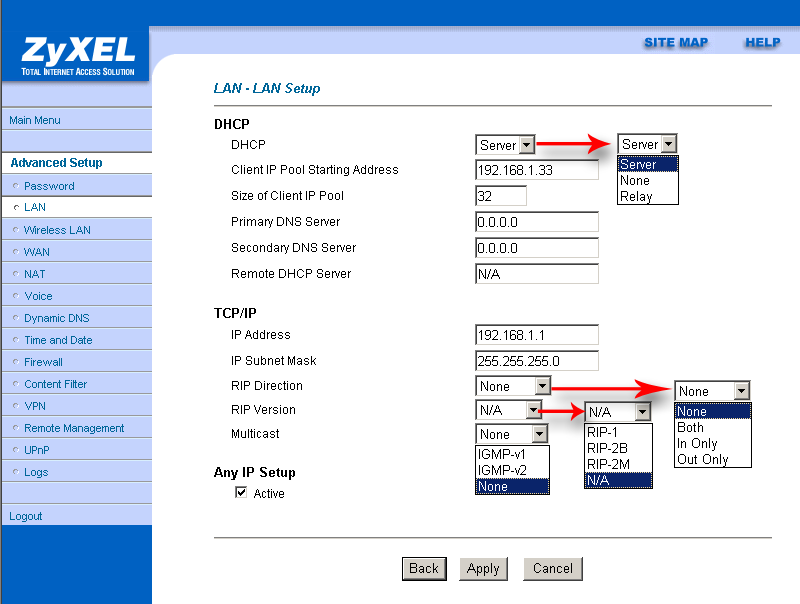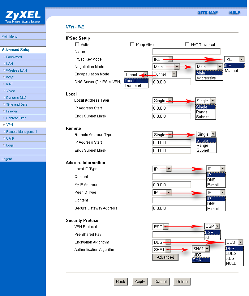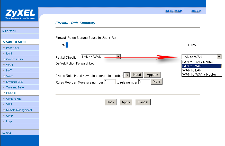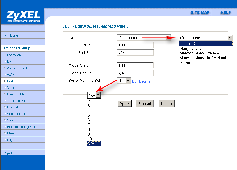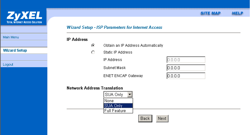 Пункт "SUA Only" (Single User Account) — используется в случае, если WAN-интерфейс имеет 1 IP-адрес. Пункт "Full Feature" применяется, когда WAN-интерфейс имеет несколько адресов.