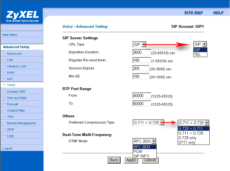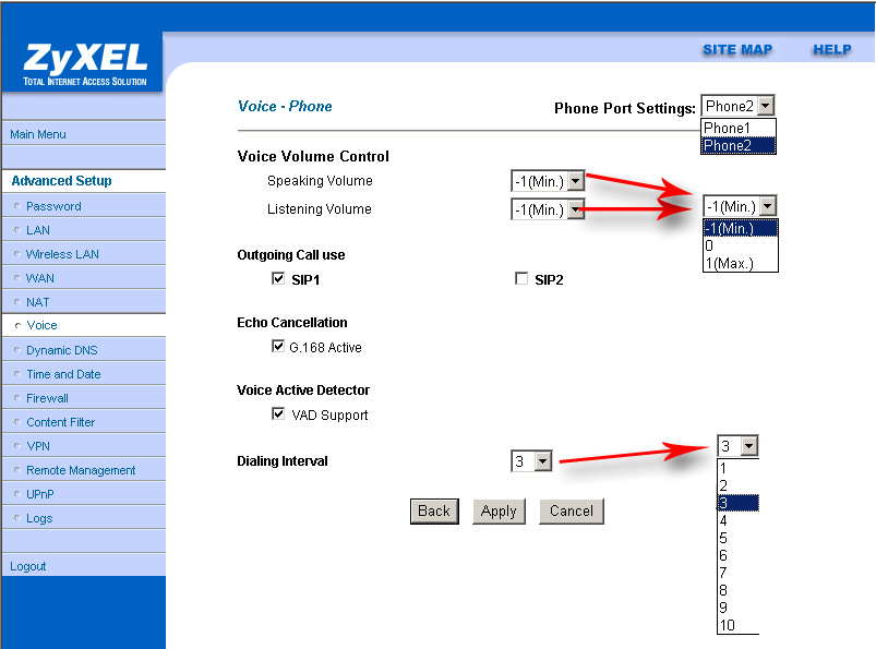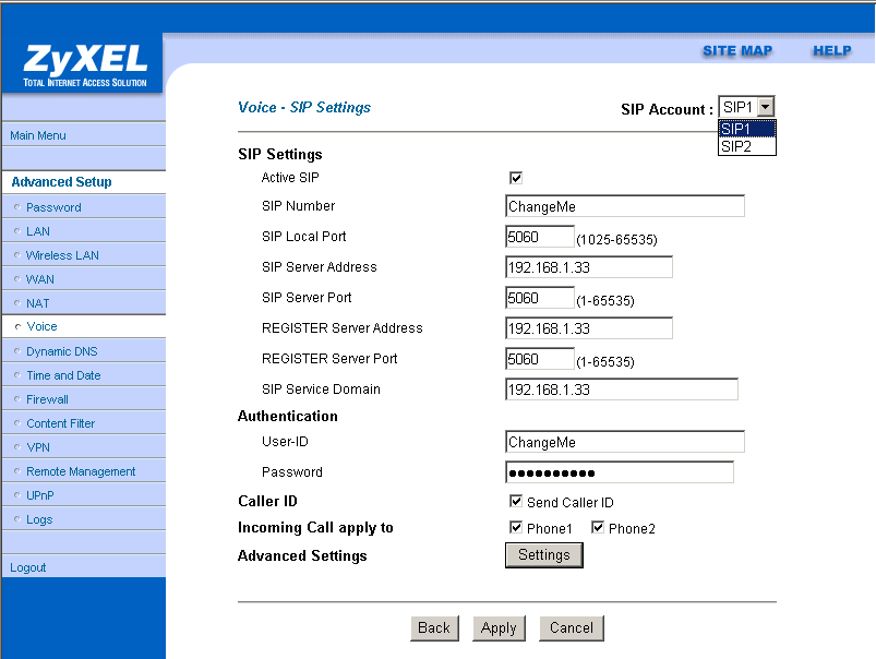 Роутер ZyXEL Prestige 2602HW поддерживает технологию VoIP (Voice over IP — голос через IP протокол) с использованием протокола SIP (Session Initiation Protocol — протокол инициирования сеанса) и позволяет подключить до двух телефонов. Рассмотрение возможностей технологии VoIP и протокола SIP не является целью данного обзора, более подробную информацию о них можно найти в Интернет.