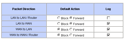 Роутер позволяет гибко настраивать правила файрвола, при этом фильтрация может производиться как в направлении LAN to WAN и WAN to LAN, так и в WAN to WAN и LAN to LAN при работе в режиме роутера. Для каждого направления можно выбрать правило по умолчанию