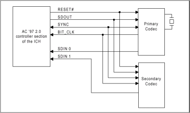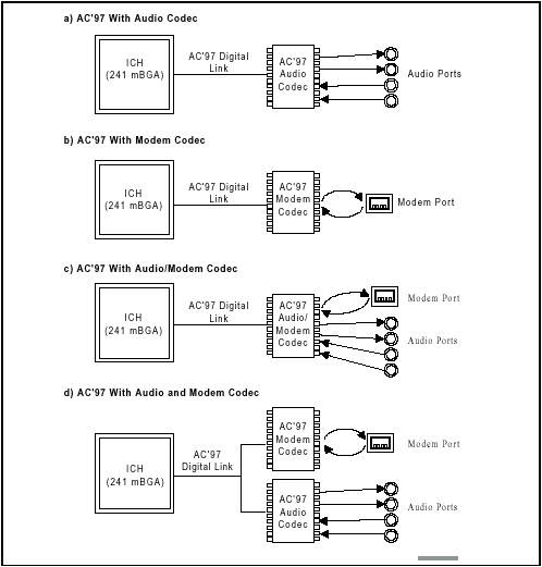 В составе недавно выпущенного Intel чипсета — i810 начал применяться новый чип — контроллер ввода/вывода — (I/O Controller HUB) 80281AA/AB, включающий в себя цифровой контроллер, соответствующий спецификации AC'97 rev 2.1, и позволяющий, благодаря использованию высокоскоростной последовательной двунаправленной цифровой шины AC-Link, поддерживать до двух устройств — аудио и модемных кодеков. Интерфейс AC-Link позволяет работать с 12 входящими и исходящими потоками данных с разрядностью 20bit и частотой дискретизации 48KHz. Устройства, отвечающие этой спецификации (это может быть как модемная, так и совмещенная аудио/модемная райзер-карта) устанавливаются в 46-и контактный слот AMR на материнской плате, напоминающий по внешнему виду укороченный вдвое слот PCI.