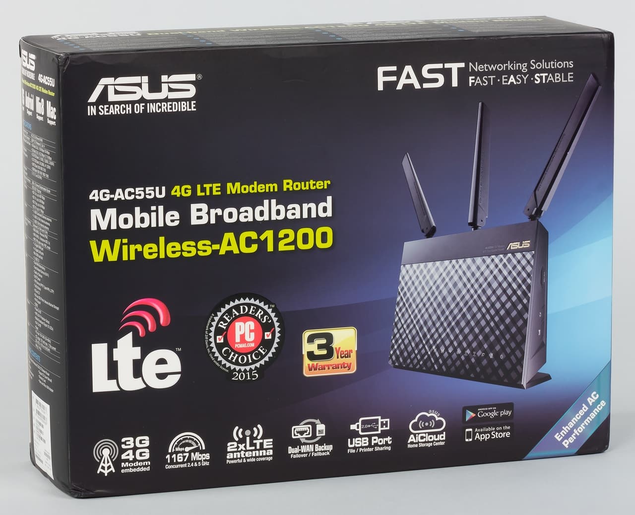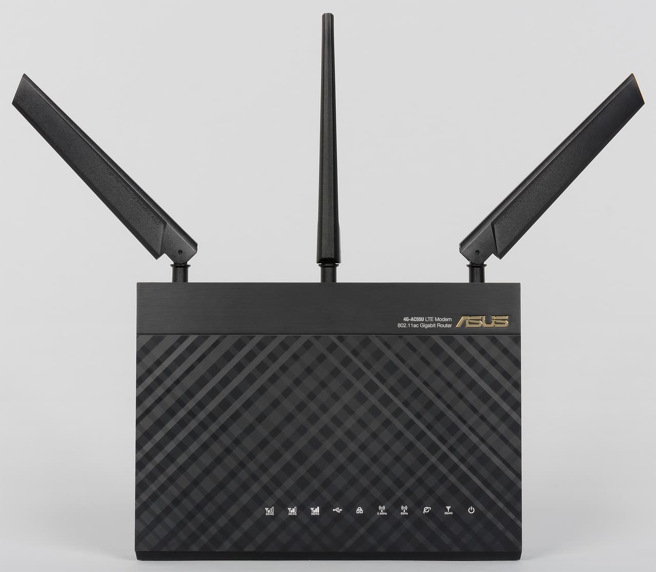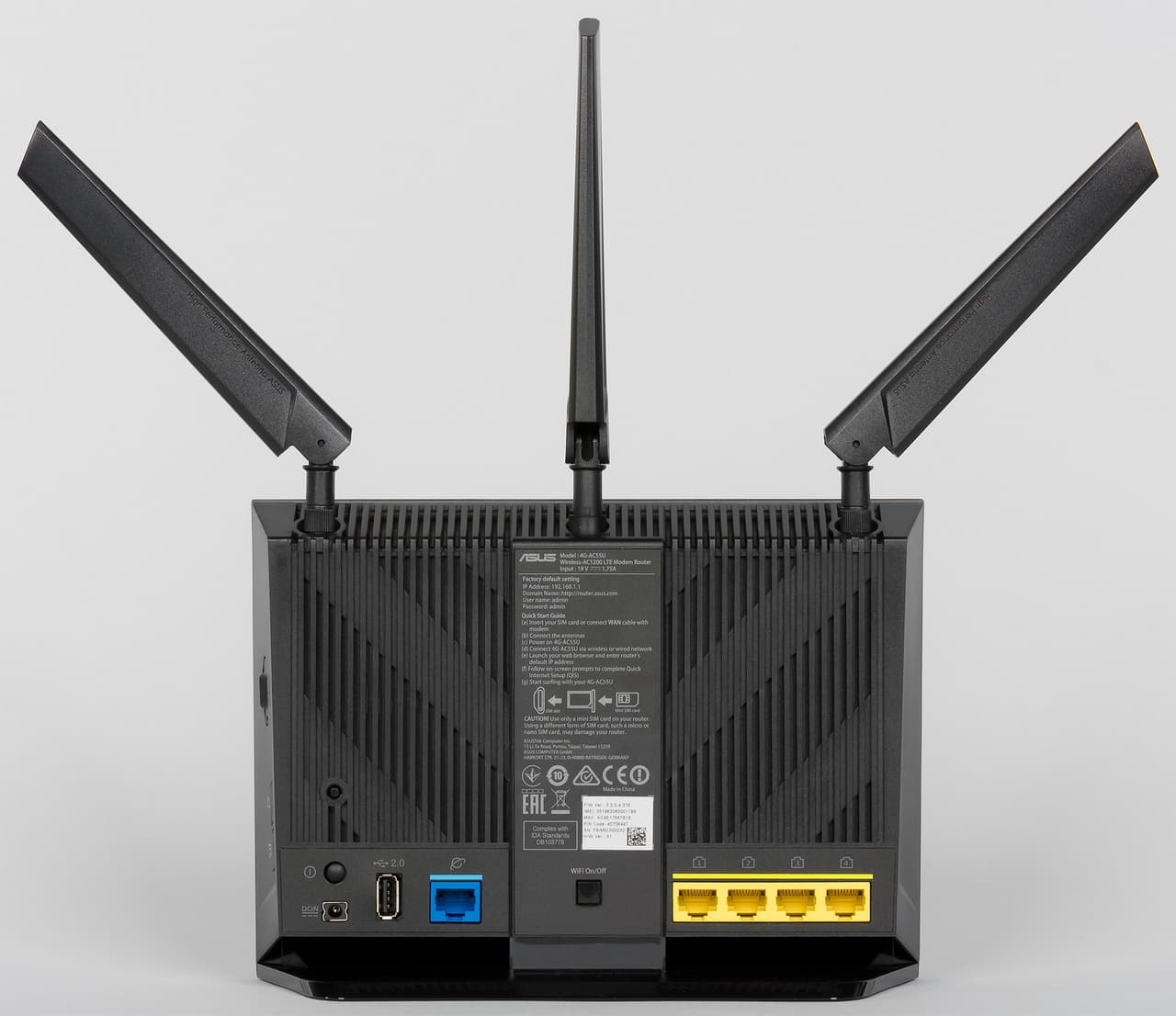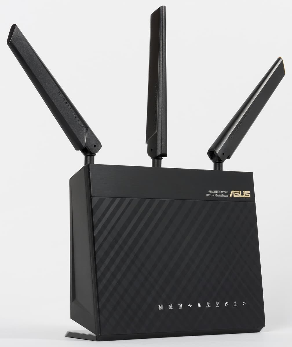 Устройство интересно наличием гигабитных сетевых портов, двухдиапазонной точки доступа с поддержкой протокола 802.11ac, портом USB, внешними антеннами для модема, фирменной многофункциональной прошивкой AsusWRT.