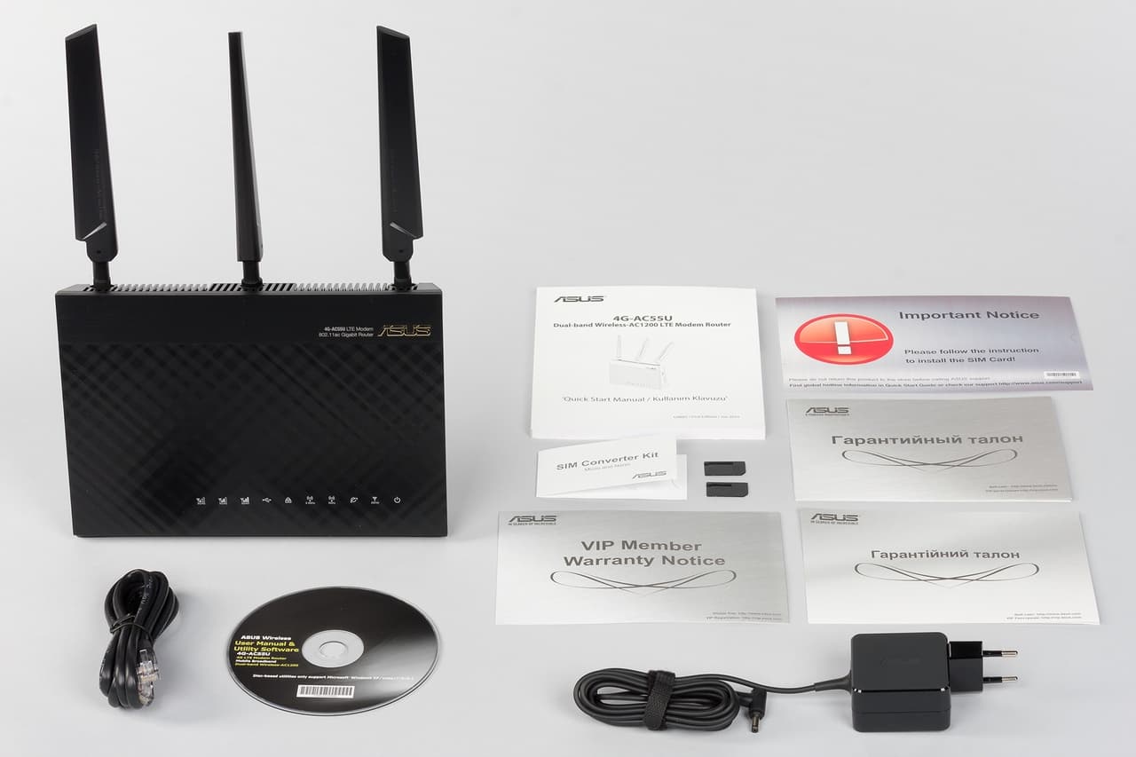 В коробке находится сам роутер, внешний блок питания для него (19 В 1,75 А), две съемные антенны, сетевой патч-корд, два адаптера для SIM-карт, краткая инструкция на нескольких языках по началу работы, компакт-диск и гарантийный талон. Отметим, что блок питания имеет небольшие габариты и не будет мешать установке в соседние розетки. Кроме того, он имеет кабель длиной более двух метров, что упростит выбор оптимального места расположения роутера. А излишки можно будет закрепить специальным хомутом с «липучкой».