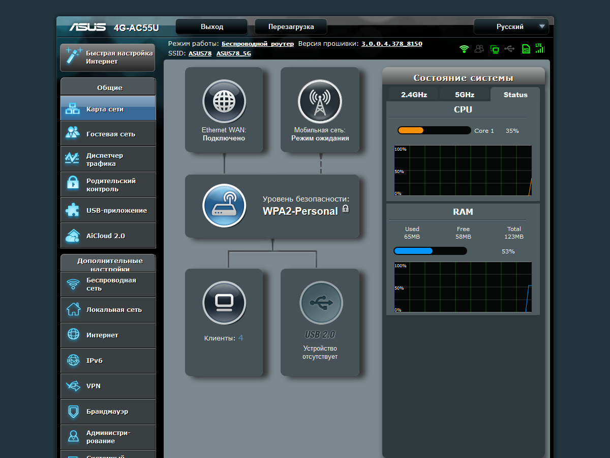 Более подробная информация о состоянии устройства представлена на странице «Карта сети». Здесь можно проверить статус подключений к интернету, число и тип клиентов, нагрузку на процессор и занятость оперативной памяти, а также многое другое.
