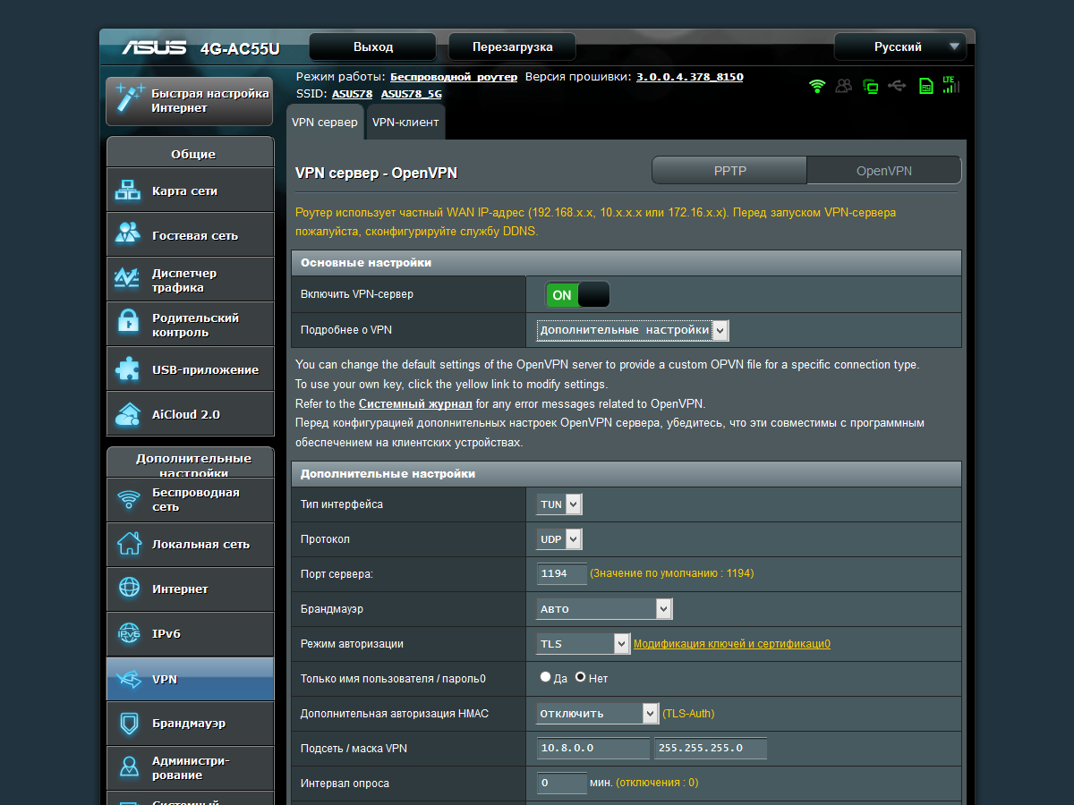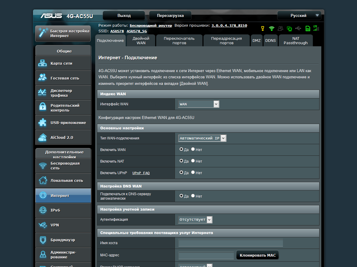 В плане использования кабельного подключения к интернету, устройство не отличается от других моделей Asus. В частности, им поддерживаются режимы IPoE, PPPoE, PPTP и L2TP со всеми привычными опциями, включая смену MAC-адреса порта WAN и доступ к локальной сети оператора при работе с VPN. Отличия заключаются в наличии встроенного модема, о чем мы расскажем в отдельном разделе далее.