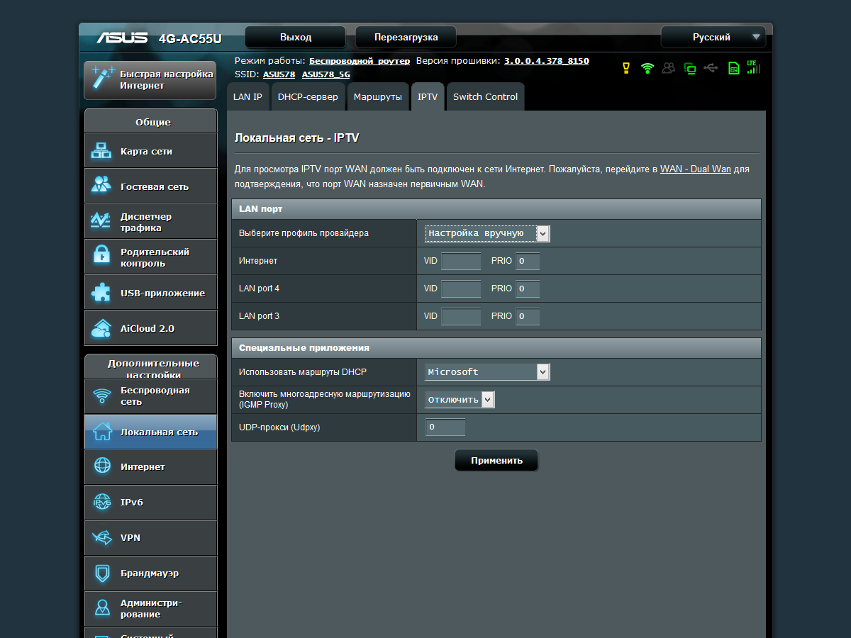 Для реализации работы с IPTV предусмотрено выделение одного или двух физических портов для приставок, работа с тегами VLAN, реализация IGMP, сервис udpxy. Как обычно, присутствуют опции по добавлению собственных записей в таблицу маршрутизации, поддержка протокола IPv6, клиент DDNS на несколько сервисов и NAT Passthrough для некоторых популярных протоколов.