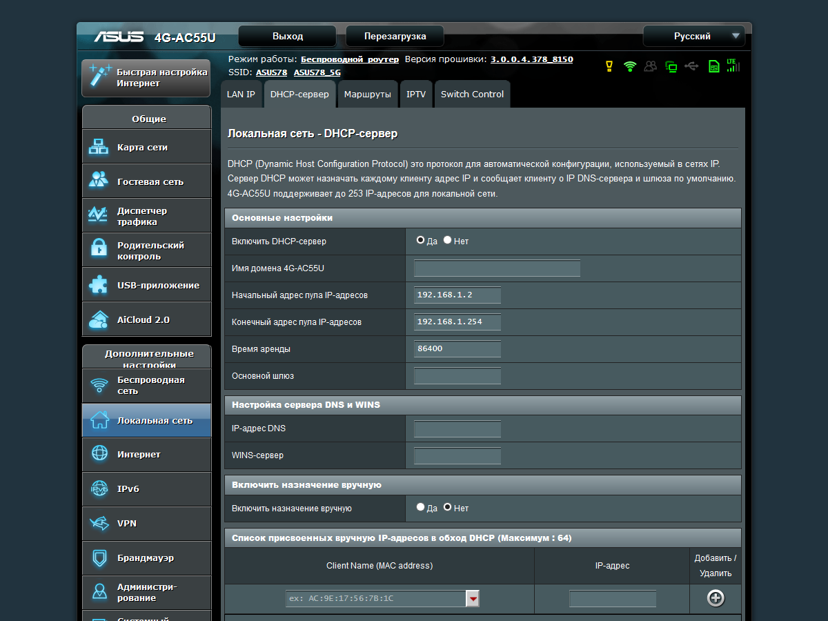 Традиционно настройка клиентов локальной сети осуществляется через сервер DHCP в роутере. Вы можете настроить здесь некоторые из его параметров работы, а также резервирование IP-адресов.