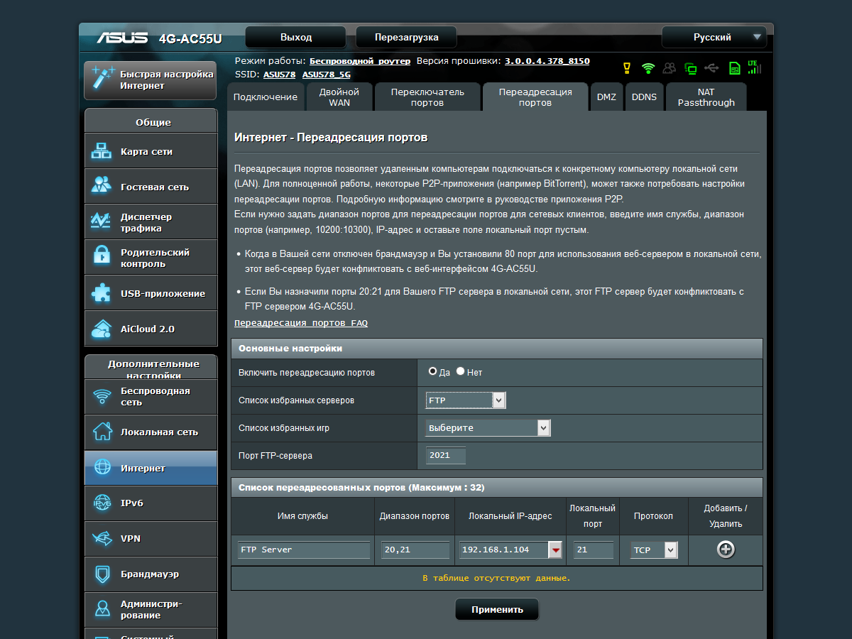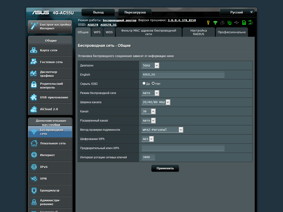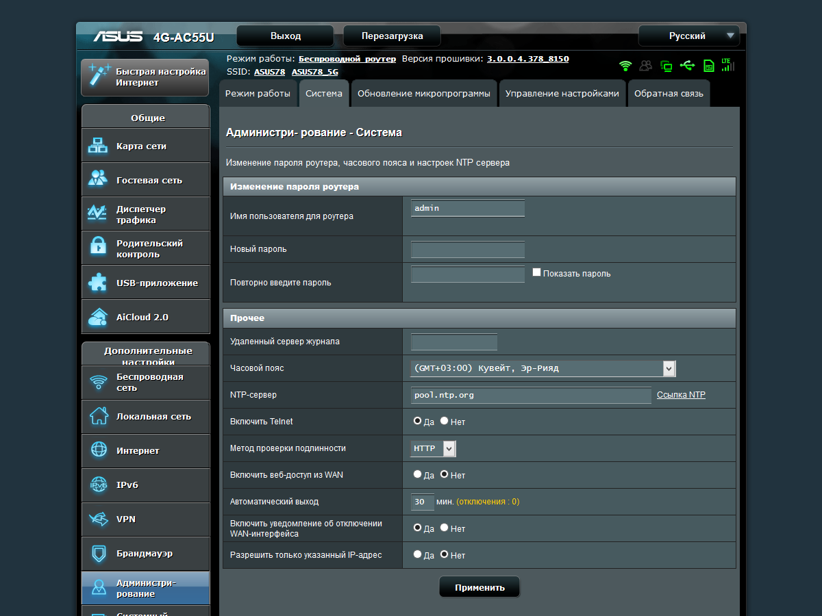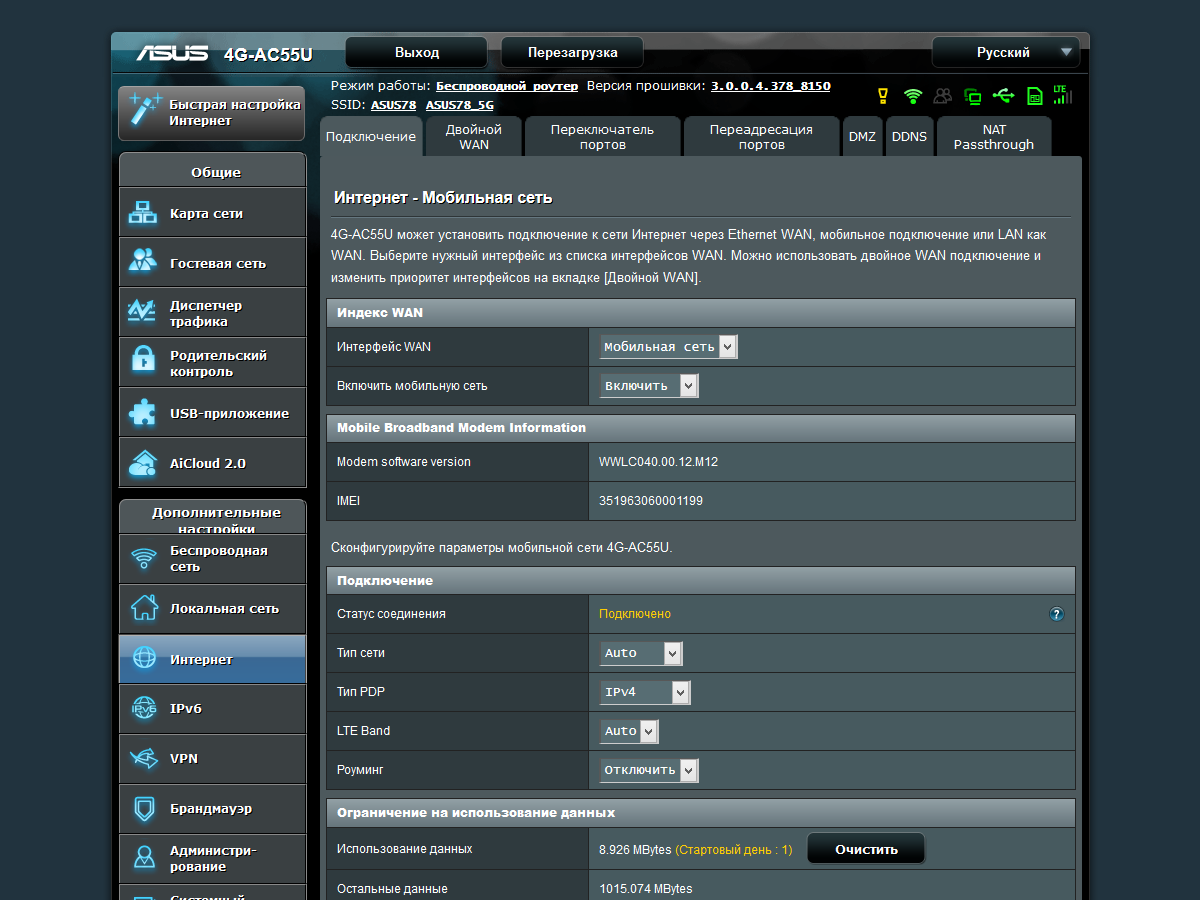 Тестирование роутера проводилось с прошивкой версии 3.0.0.4.378_8150. Обновление возможно из заранее загруженного файла или автоматически с сайта производителя. В данной модели предусмотрена также возможность обновления и программного обеспечения встроенного сотового модема. Правда, для этого придется использовать подключаемый в порт USB роутера накопитель, так что удаленно эту операцию можно провести, только если флэшка уже была установлена заранее. В дальнейшем тестировании использовалась версия ПО модема WWLC040.00.12.M12.