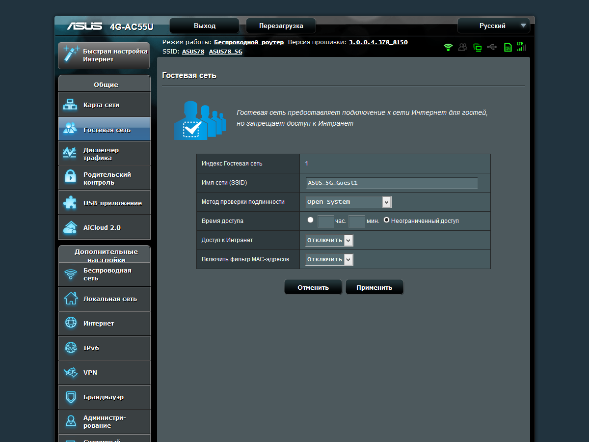 На каждой странице присутствуют удобные пункты выхода, перезагрузки, быстрого перехода к обновлению прошивки и настройкам беспроводных сетей. Также есть несколько полезных дополнительных значков в верхнем правом углу, включая индикацию соединения по сотовой сети.