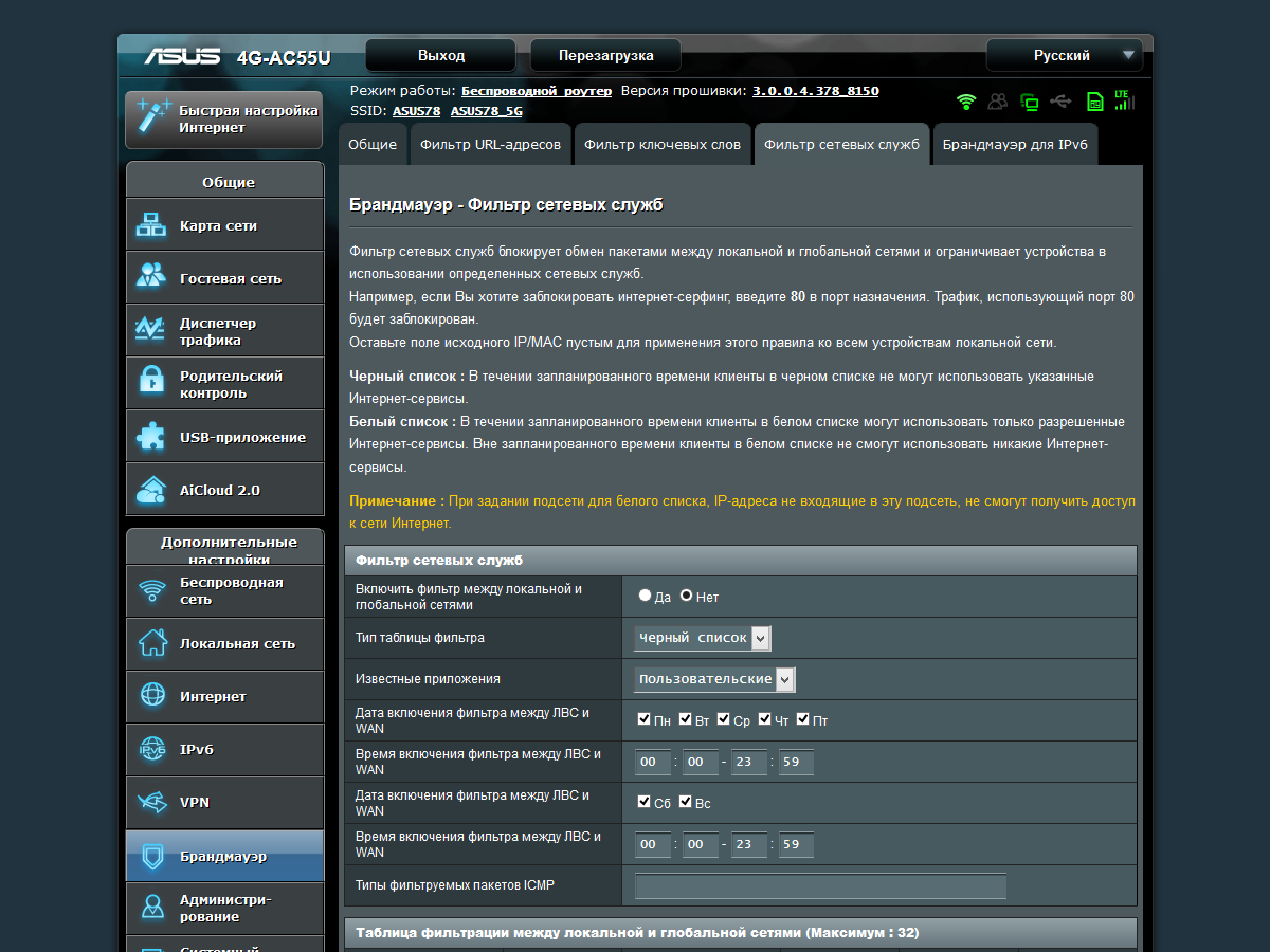 Функции защиты включают в себя традиционный межсетевой экран с модулем обнаружения DoS и настраиваемыми пользователем правилами доступа, а также фильтры URL-адресов и ключевых слов. Отметим, что брандмауэр может работать и с протоколом IPv6.