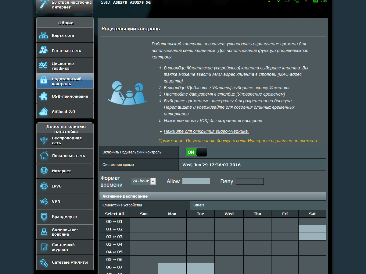 Не забыли здесь и о «Родительском контроле». Эта функция позволяет ограничивать доступ индивидуальных клиентов к интернету по расписанию, которое создается на неделю с точностью до часа.